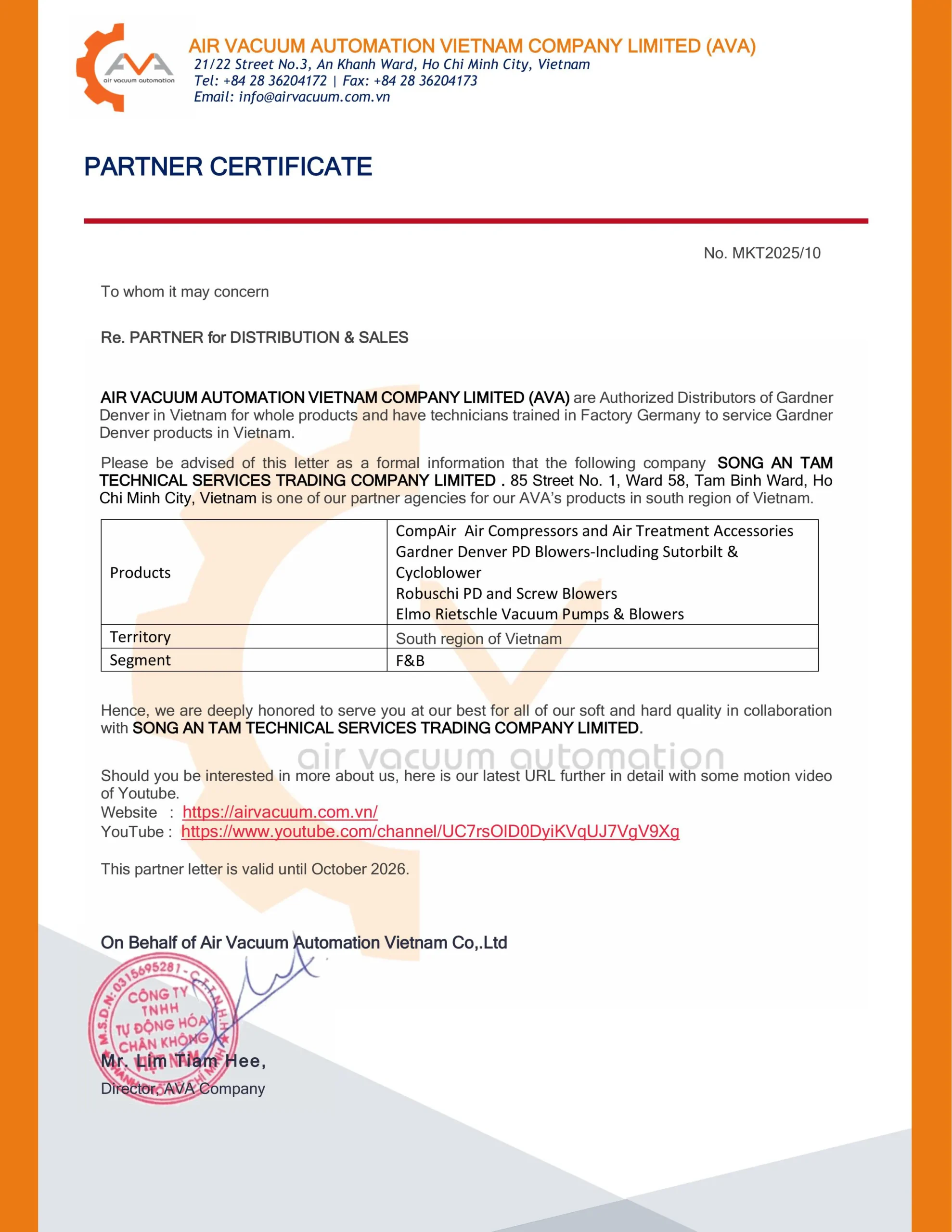 Công ty TNHH Thương mại – Dịch vụ Kỹ thuật Song An Tâm chính thức là đại lý của AVA (Air Vacuum Automation Vietnam Co., Ltd) cho các thương hiệu: